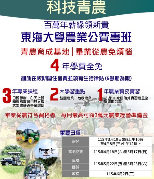 [新聞] 大學「農業專班」4年爽領40萬 東海首招加碼:住宿也免費