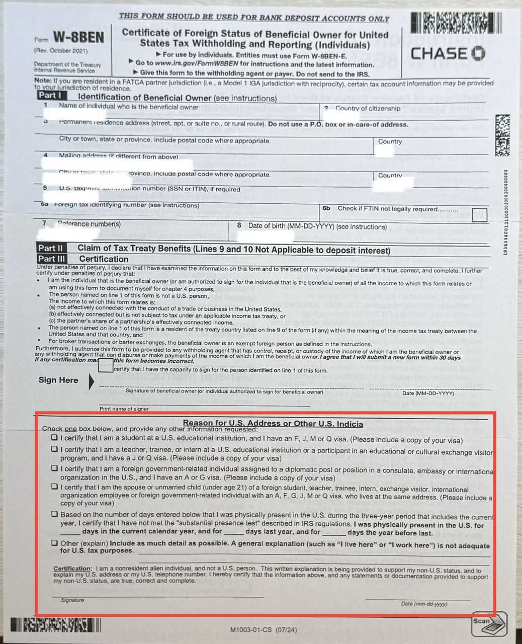 不過chase收到後又寄了一份新的要我填寫後寄回