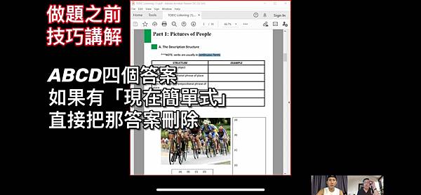 Ex: 第一部分圖片。如果看到人物卻沒有Ving詞性,直接刪掉不用管裡面內容