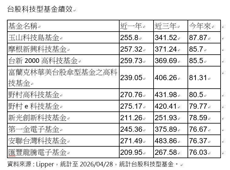 [新聞] 台股科技基金超狂 這5檔今年來報酬率超過8成