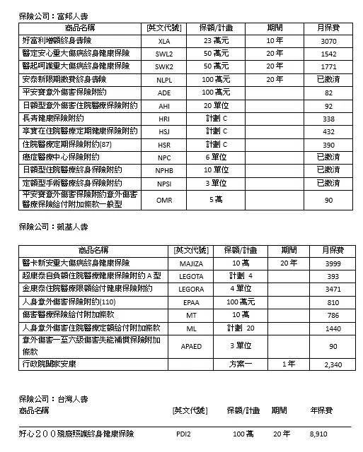 九、現有保險:富邦人壽、凱基人壽、台灣人壽