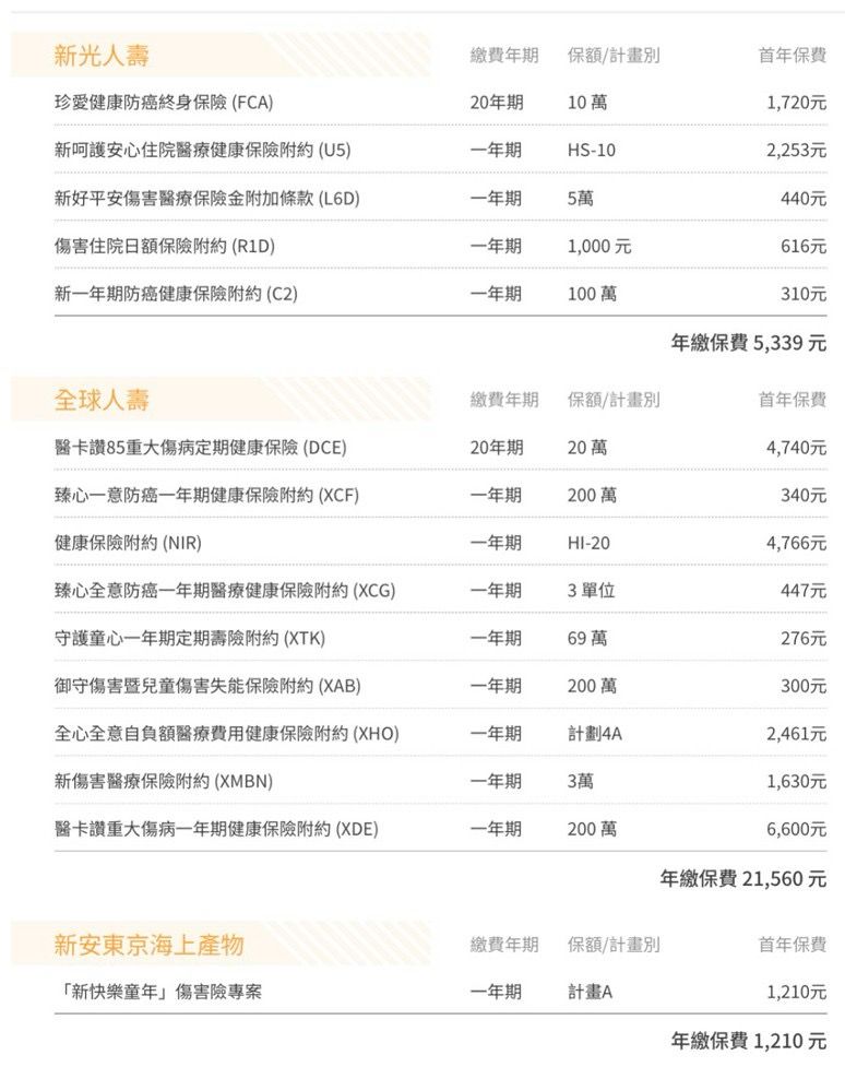 目前開始幫新生兒規劃保單中,整理下之前大家的保單如上,因經濟能力還可以支持更高