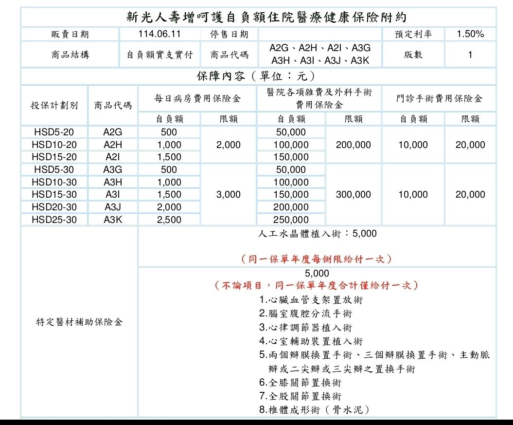 保額內容為新光A2增呵護,計畫別HSD25-30(自付額25萬,限額30萬)