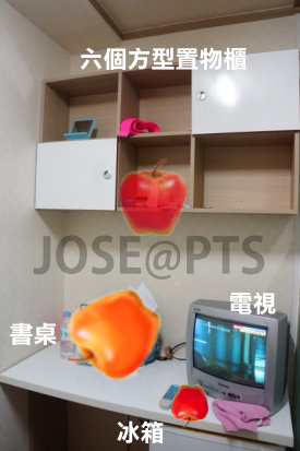 A:房間內的擺設有TV.冰箱.桌子.椅子.衣櫃(+衣架3-4個).書櫃(六個方櫃在牆上)