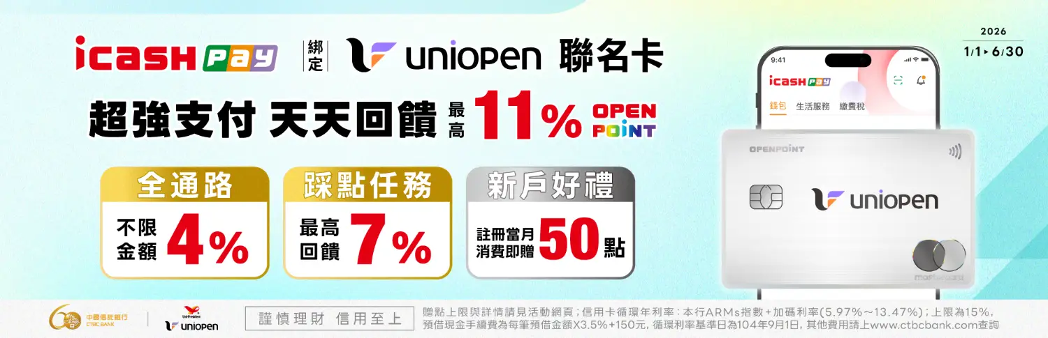 icash Pay超強支付 綁uniopen聯名卡天天最高11%