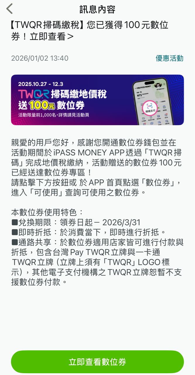 Re: [情報] 用iPASS MONEY繳地價稅即贈100元數位券
