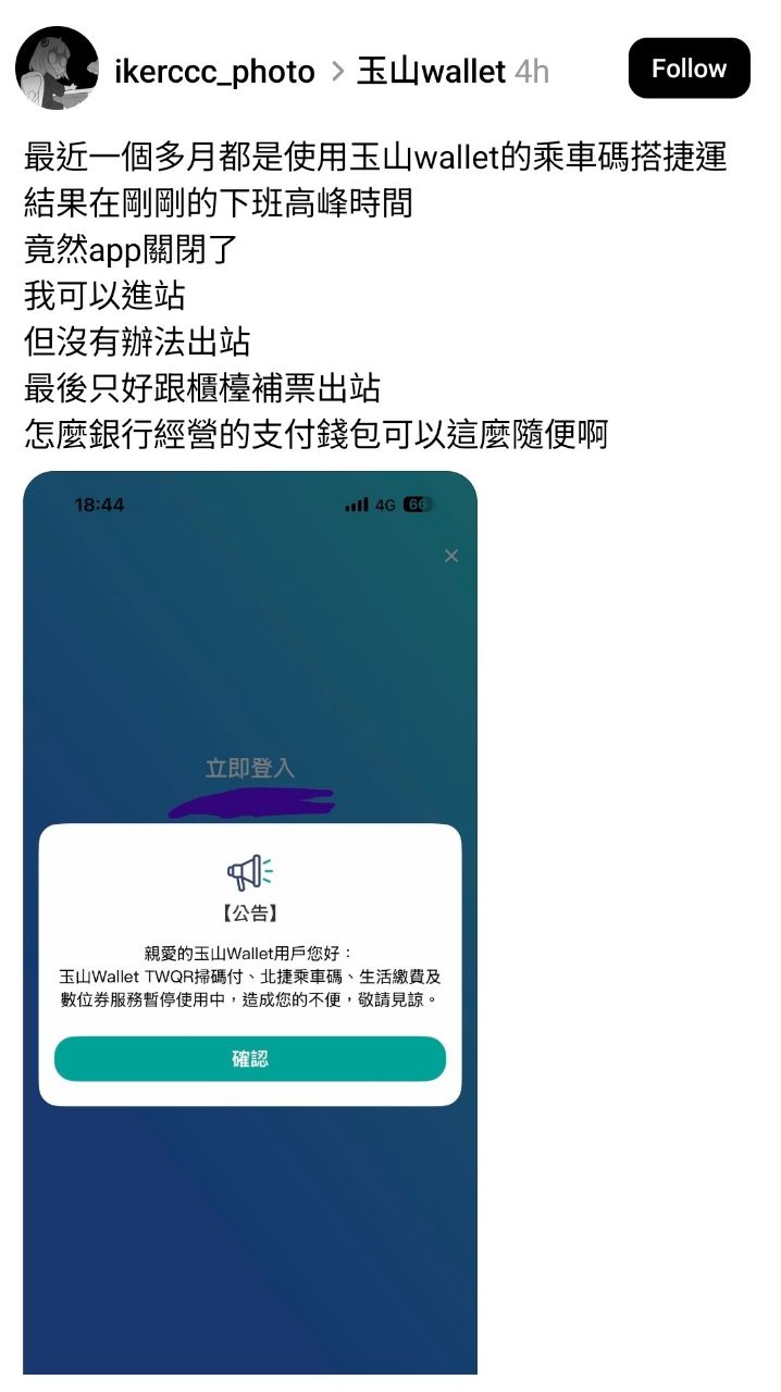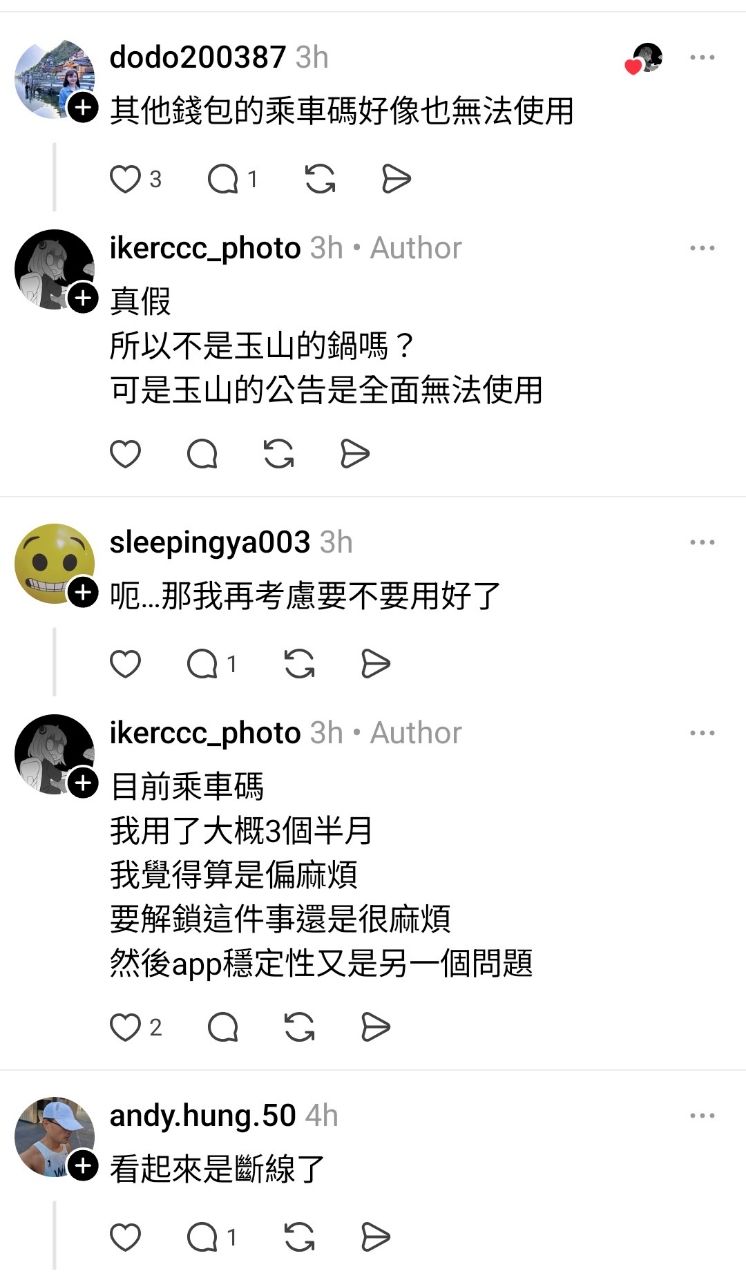 上玉山Wallet直接公告乘車碼、TWQR掃碼付等功能暫停使用。也有網友回饋其他電子支付