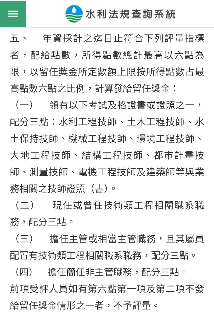 但在全國水利工程最高指導單位水利署,這份獎金被無情的玩成了「記點制度」。根據規定,除了需辦理工程業務的職系點數外,你必須具備「技師證照」或「主管(簡任)職務」才能領到全額留任獎金。