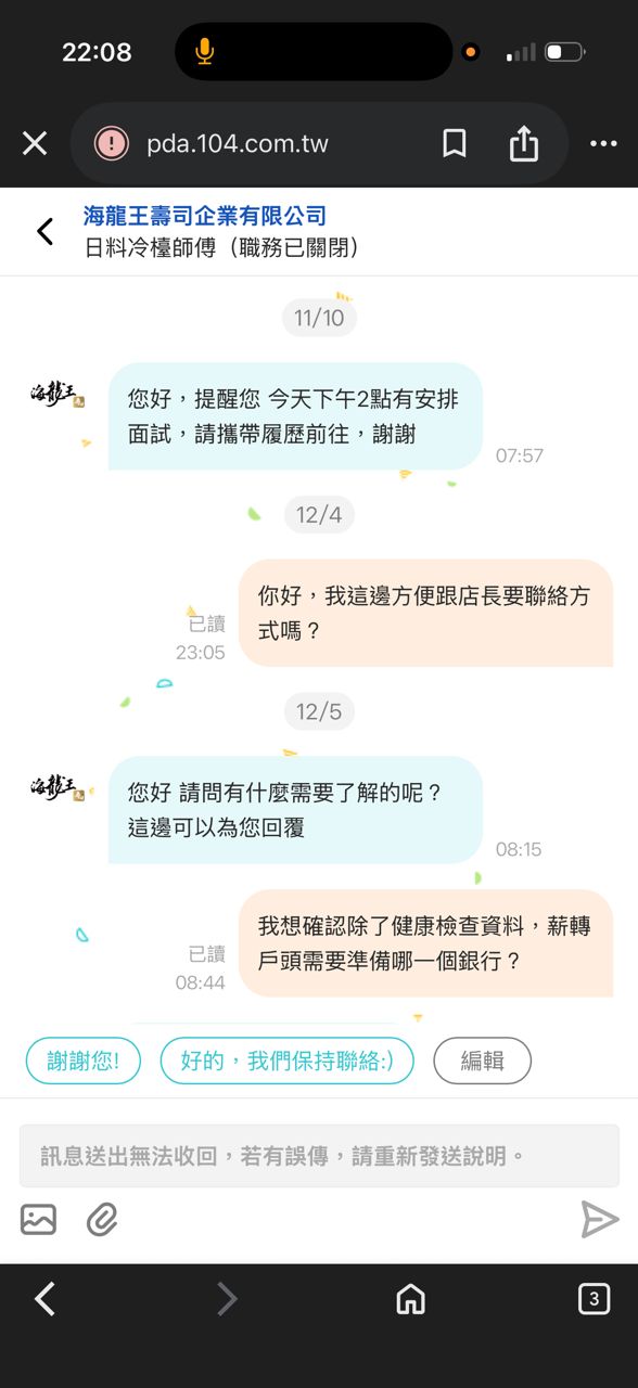 於11/10前往這間公司面試,期間有提到我需要到1/1才能到職,公司老闆也承諾會保留職