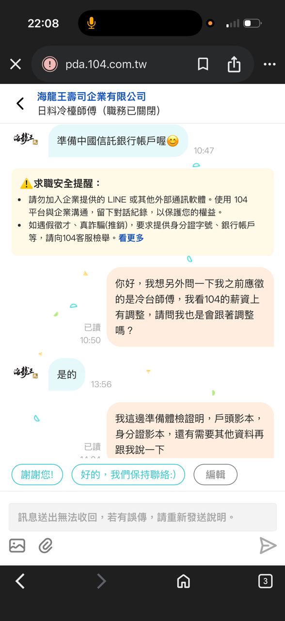 缺等我到1/1,我於12/5日還在104詢問是否有公司老闆的聯絡方式,他們說使用104就可