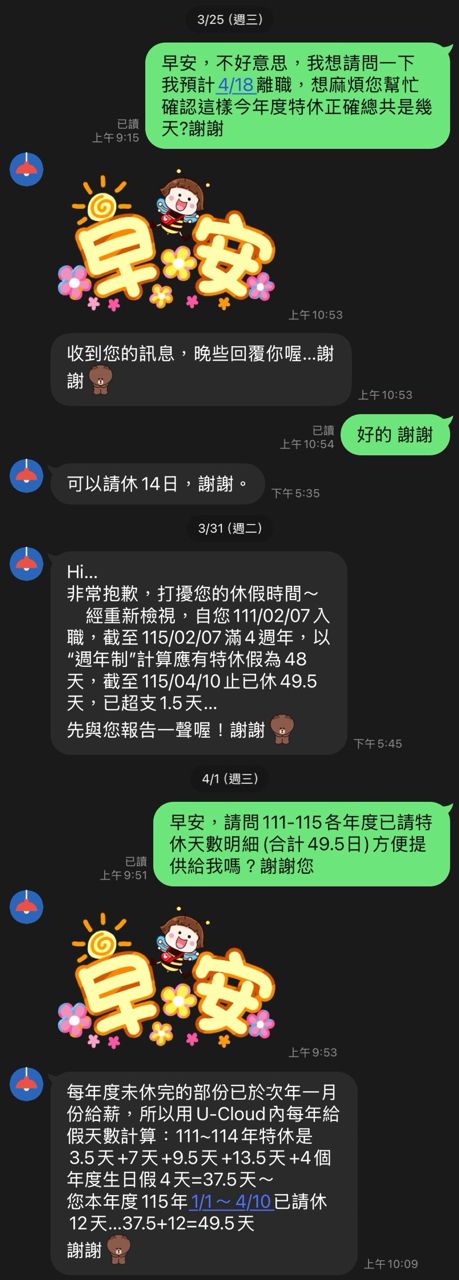今年三月底,有先跟HR確認特休,當時說是14天,所以我就照這個數量去安排休假,到現
