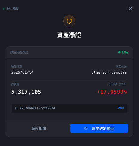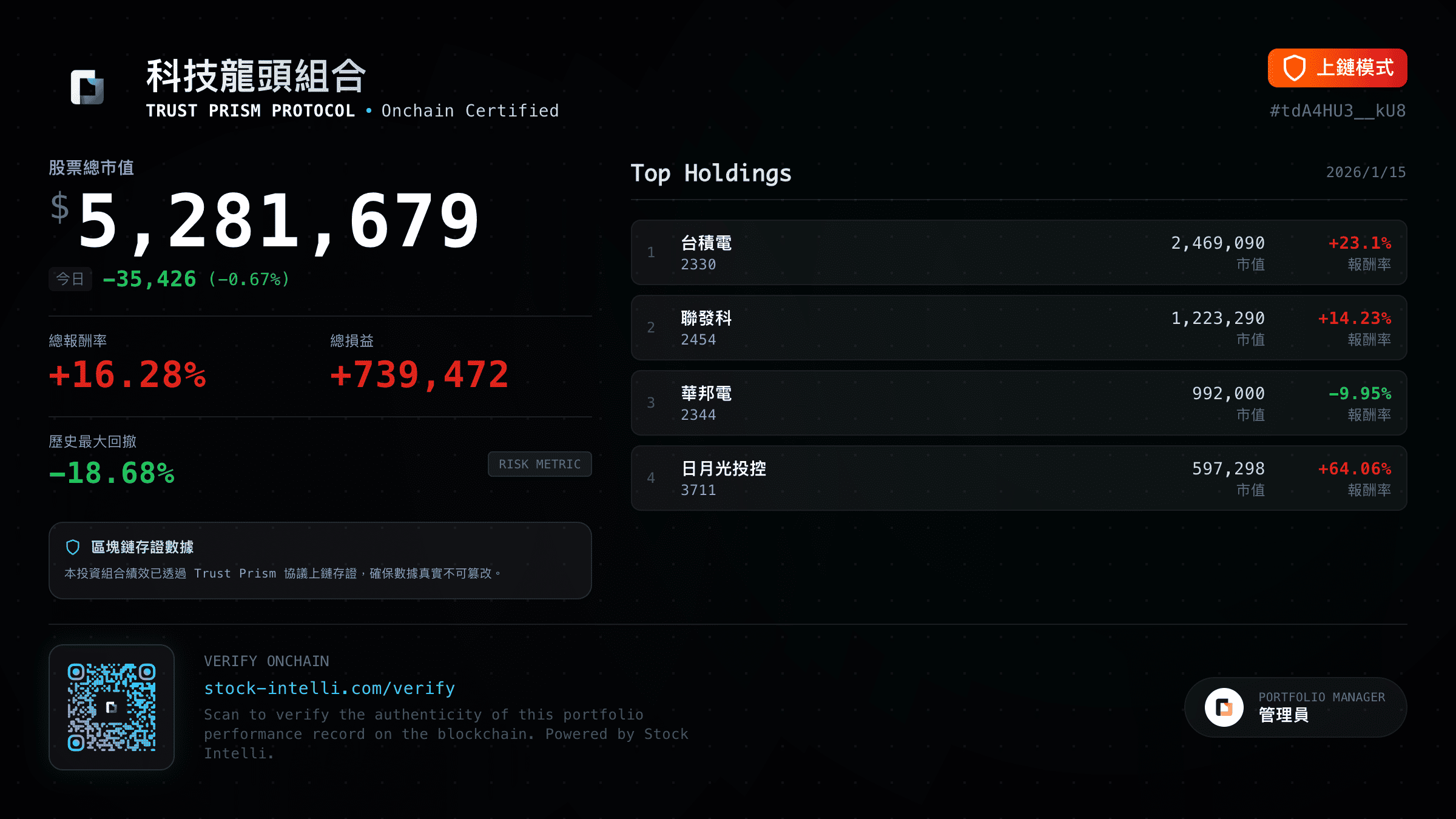上鏈組合(區塊鏈對帳單):利用區塊鏈不可逆特性,建立可驗證的真實投資績效紀錄。