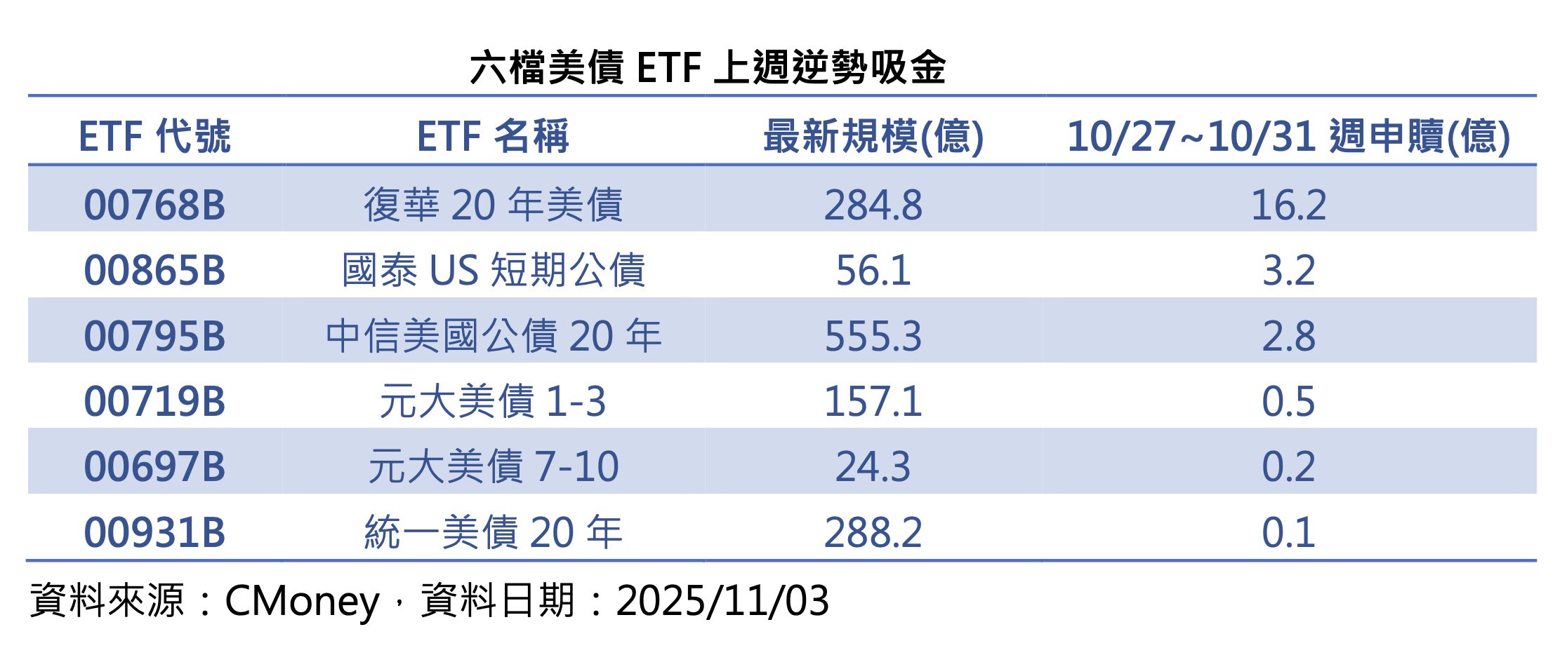 美國聯準會(Fed)於10月底再度降息1碼,激勵市場信心,也帶動近一週美債ETF買氣明