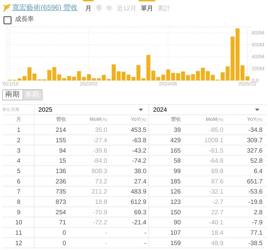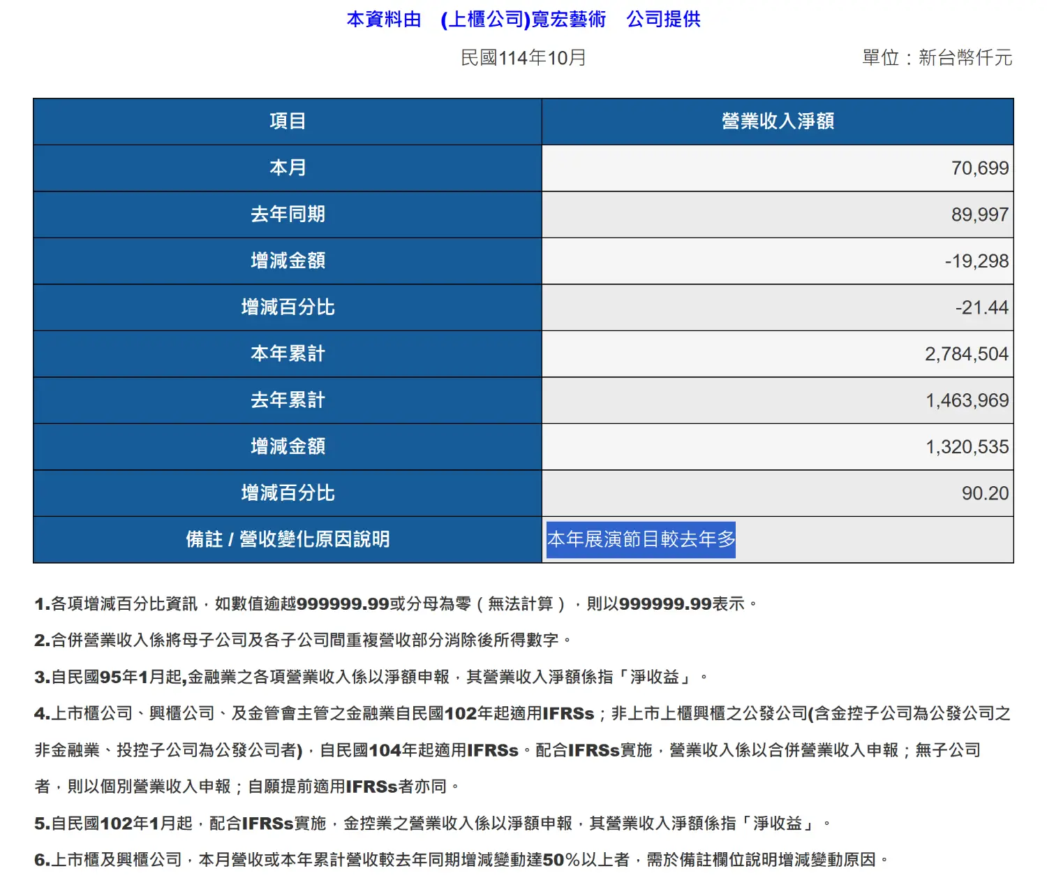 [情報] 6596 寬宏藝術 10月 MoM -72.2 YoY -21.4
