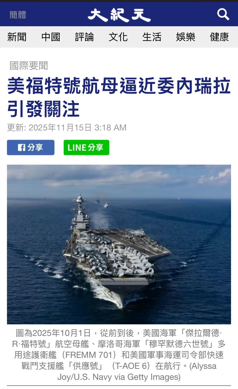 與此同時,美國“傑拉爾德·R·福特”號航母打擊群正逼近委內瑞拉附近海域