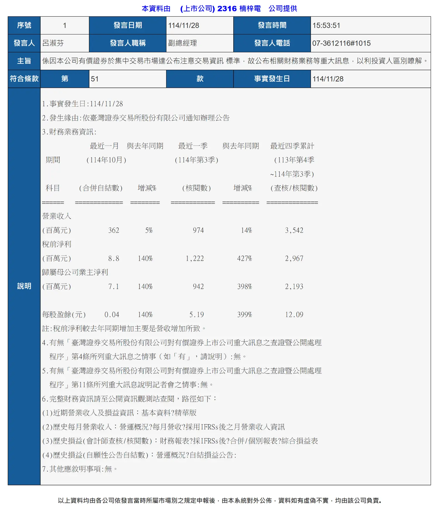 [情報] 2316 楠梓電 10月自結 本業虧轉盈