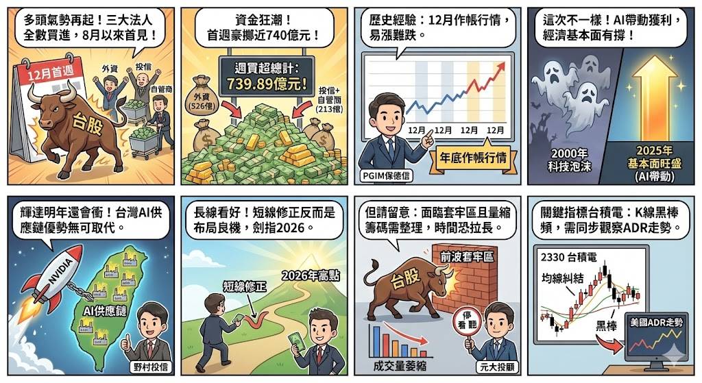 週買超高達739.89億元。法人認為,年底作帳行情啟動,指數有望再創高點,進入2026年