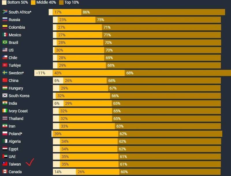 台灣部分,收入前10%群體取得全國48%的總收入,而收入最低的50%人口僅分得12%。在財