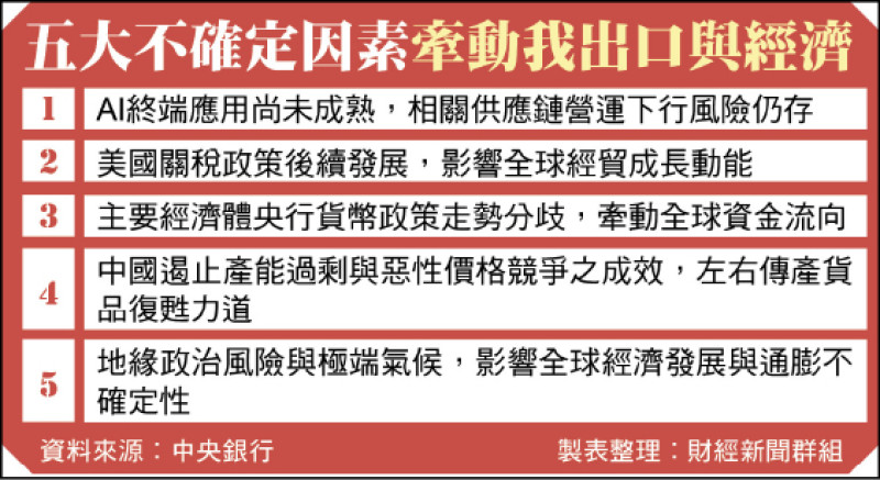 中央銀行最新報告列舉全球及台灣經濟面臨的5大不確定性,其中AI(人工智慧)泡沫化