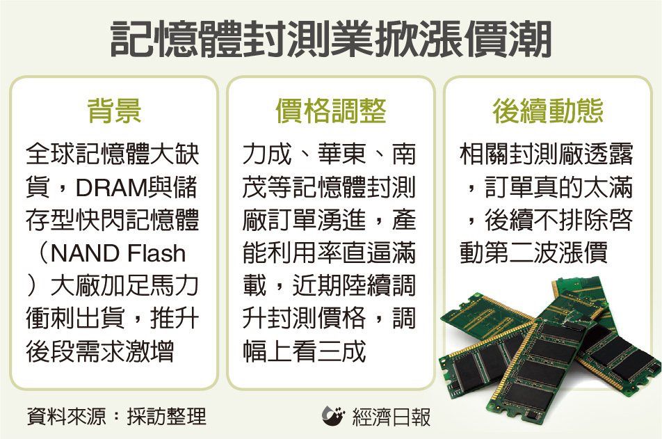 記憶體晶片缺貨大漲價熱潮,蔓延至下游封測領域。受惠DRAM與儲存型快閃記憶體(NAND