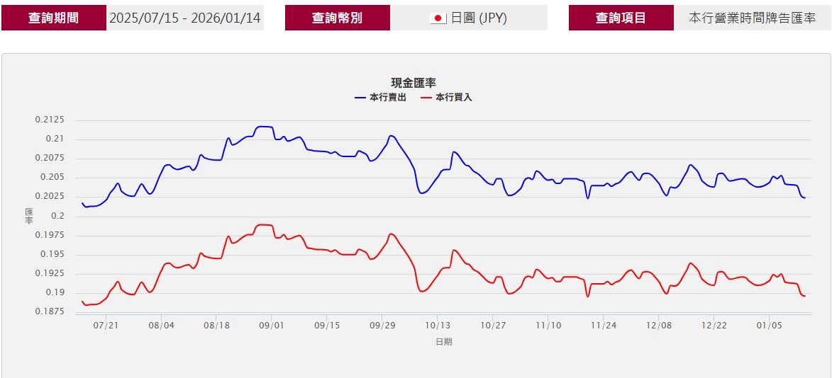 ,台銀上午日圓現鈔換匯則來到0.203,是2026年迄今最低價。