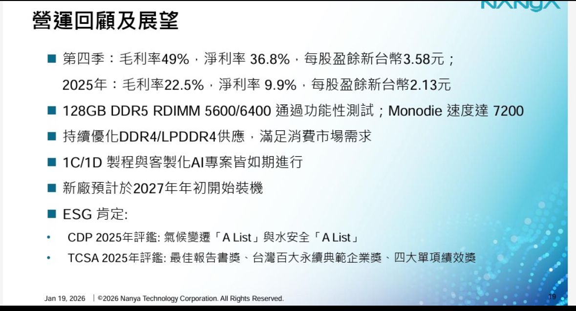 記憶體龍頭南亞科技(2408)今(19)日公佈 2025 年第四季自行結算合併財務報告。受