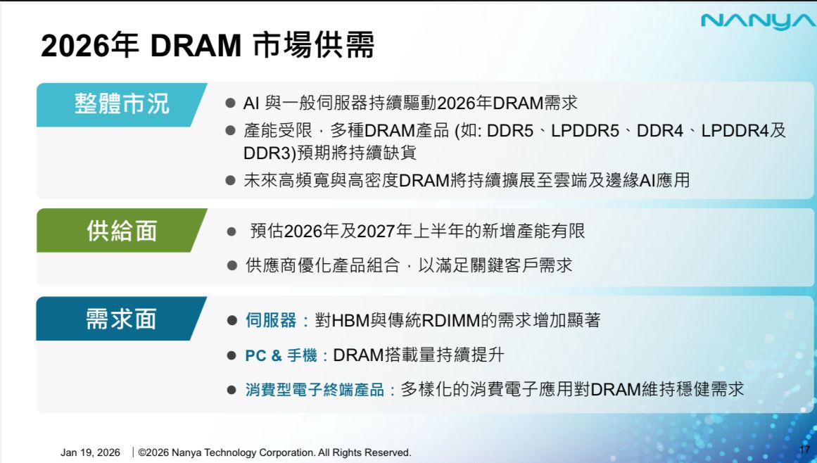 展望 2026 年 DRAM 市場,南亞科預期在 AI 與一般伺服器的雙重驅動下,需求將持續強