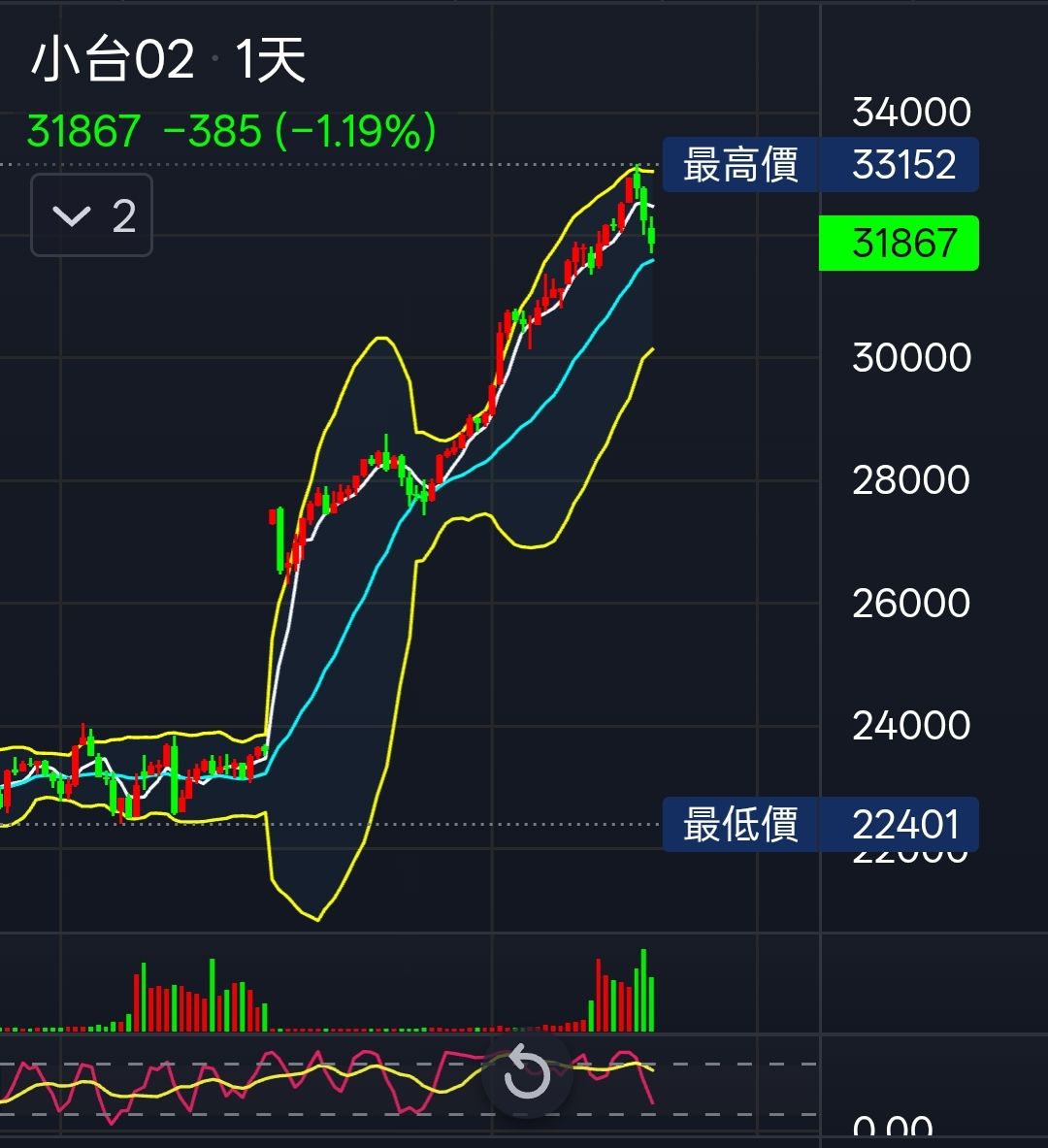 當前第二波:1385 -> 1835 創天價,目前高點爆量留長上影線。