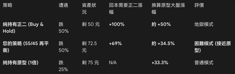 : 但是, 如果有實行再平衡機制, 正二就只需要漲 34.5% 就能回本, 小幅落後原型