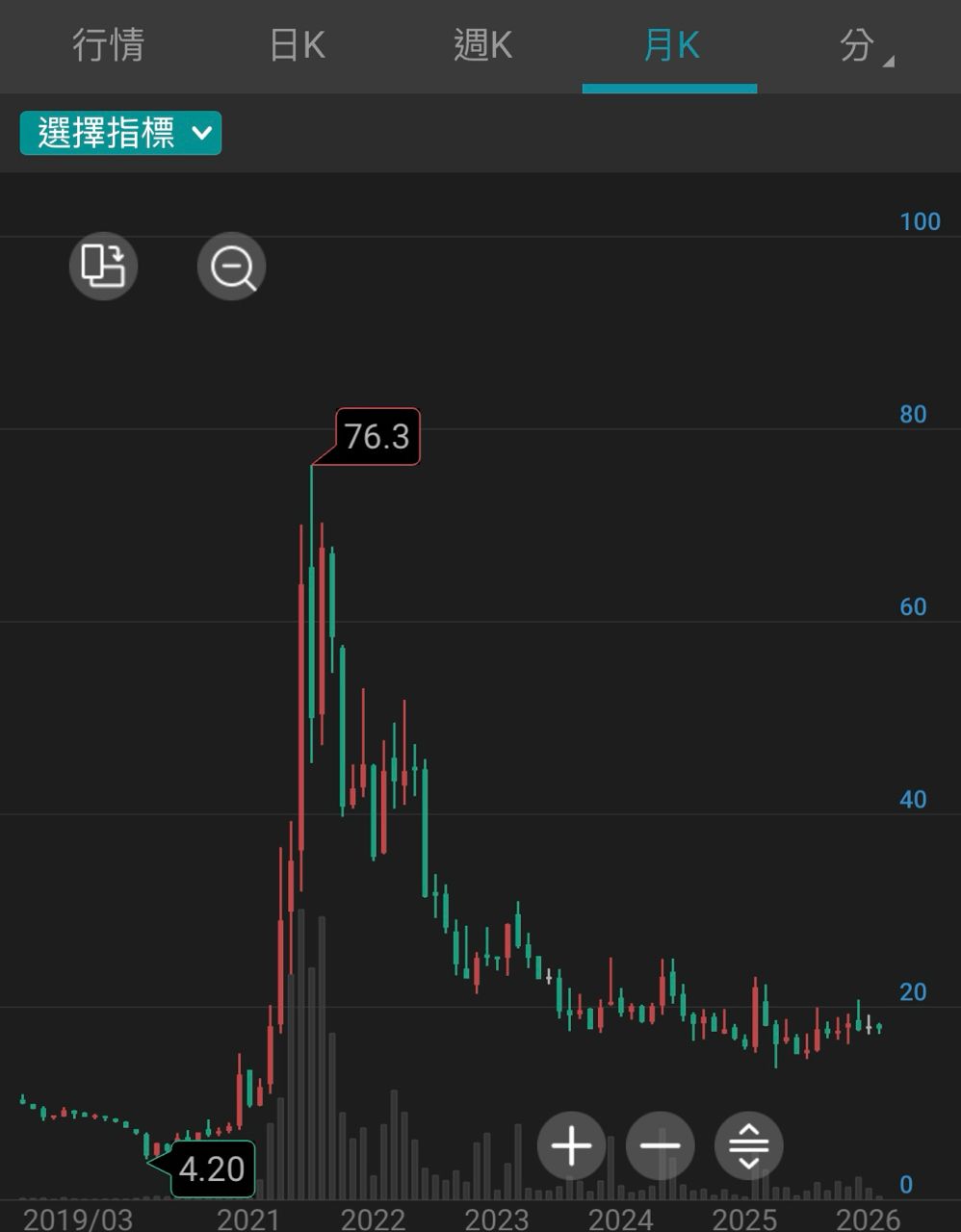 月K格局:四維航自2021年七月創下近年新高76.3後一路下殺,近期最低點為13.65-為低