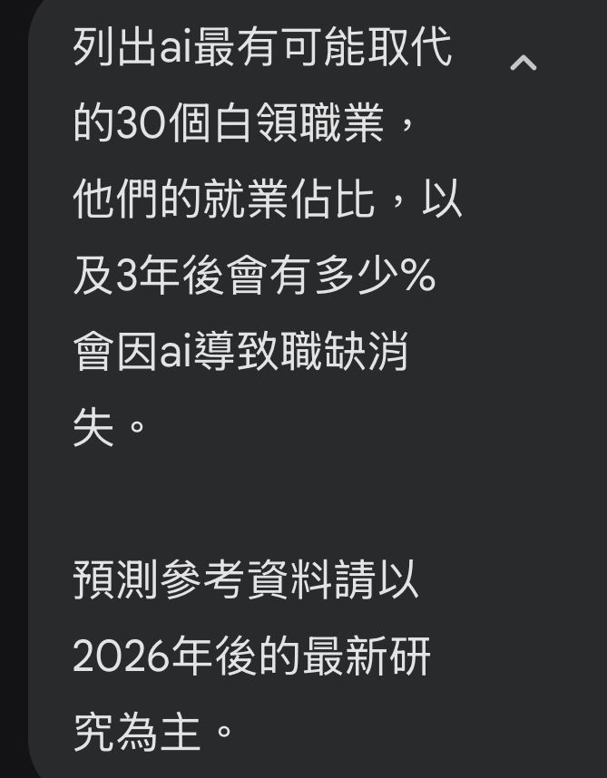 排名,職業名稱,就業佔比 (約),3年後預估消失%,主要原因 (2026觀點)