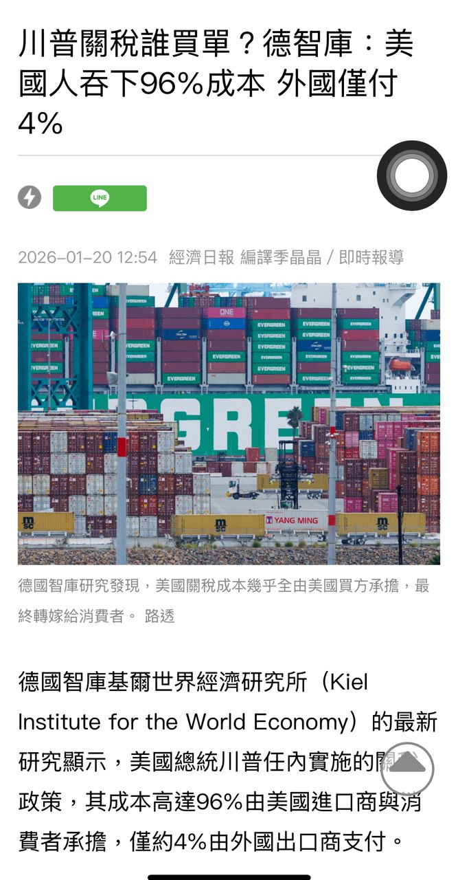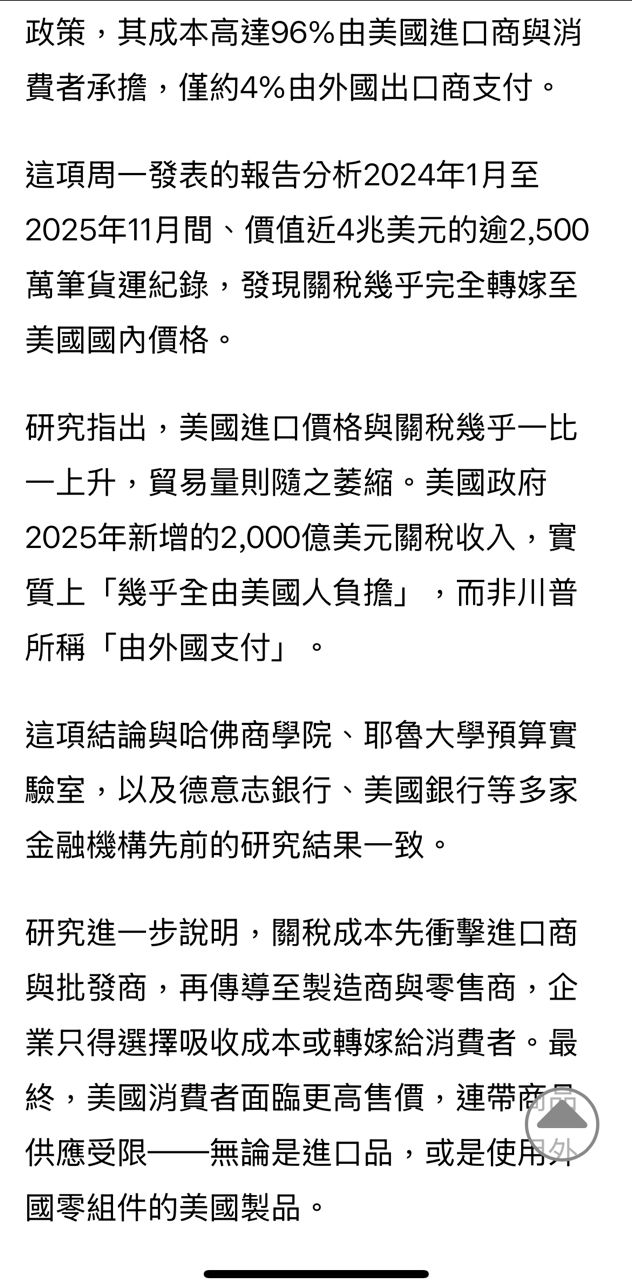 我們看德國智庫的研究,美國2024年1月~2025年11月,這四兆進口貨物幾乎全數轉嫁美