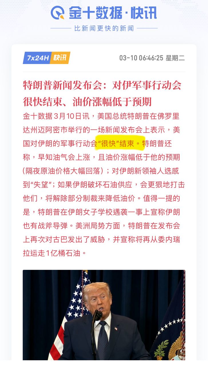 說法,聲稱伊朗戰爭可能即將結束,此話一出,油價急速轉跌至100美元以下,美股則由