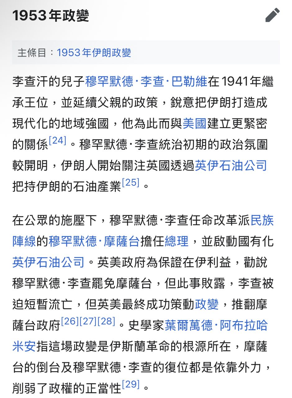 之後美國扶持獨裁的巴列維王朝(原本是君主立憲後來變成實權在握)