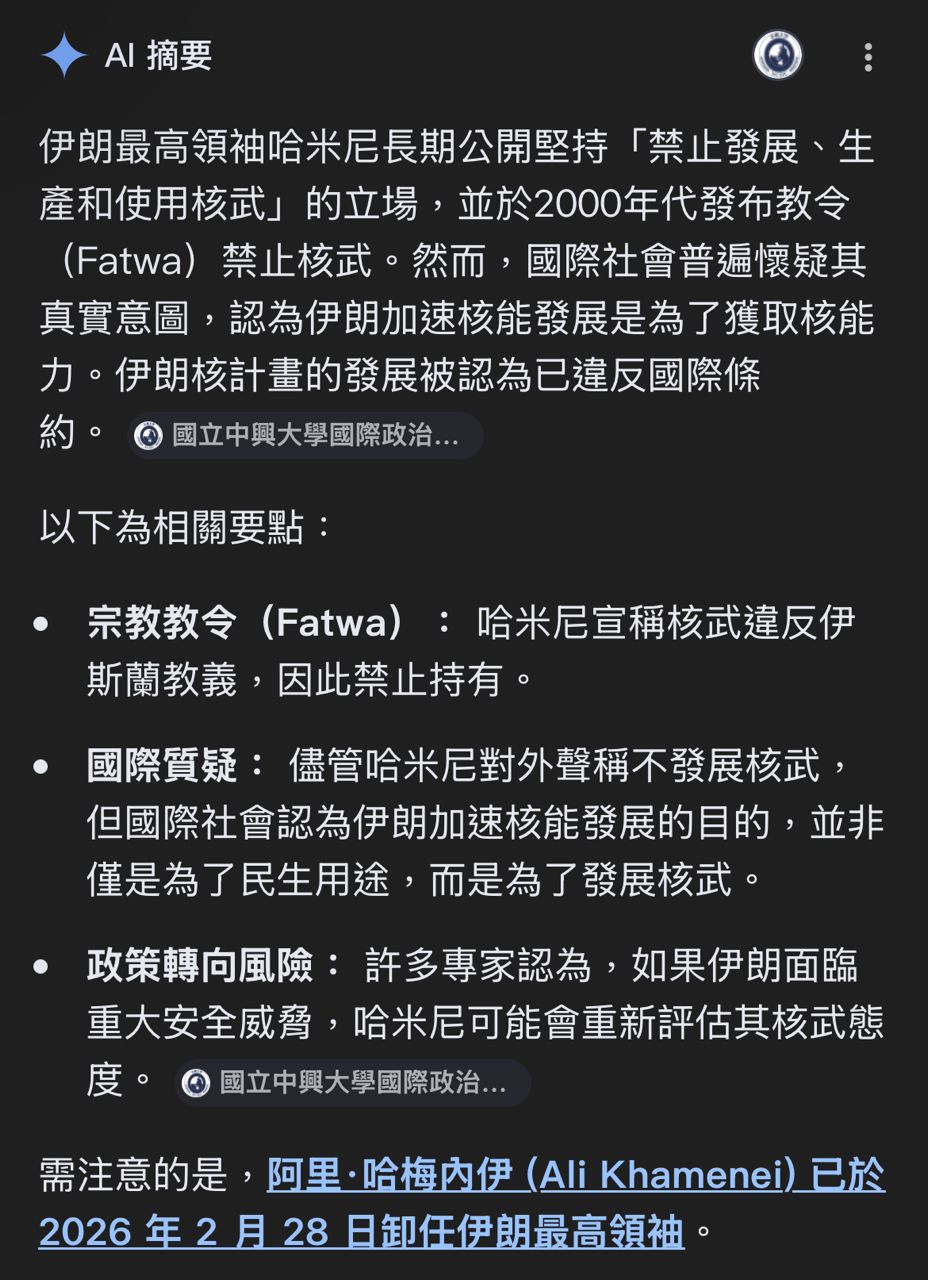 看懂了嗎?伊朗本身是不想有核武的,或至少說老哈米尼是不想有核武的,他想利用不發