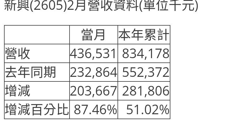 [情報] 新興 115年2月營收4.37億、年增87.46%