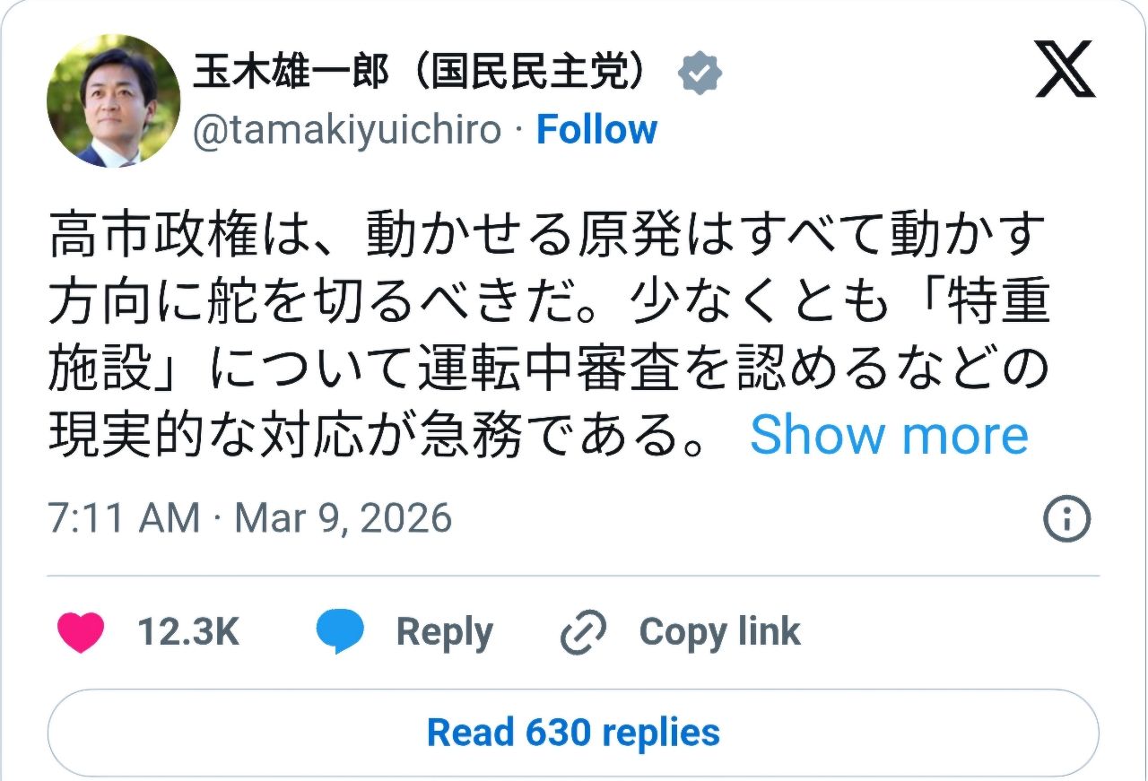 日本反對黨國民民主黨黨魁玉木雄一郎在9日公開表示,日本應考慮運轉所有目前仍可使