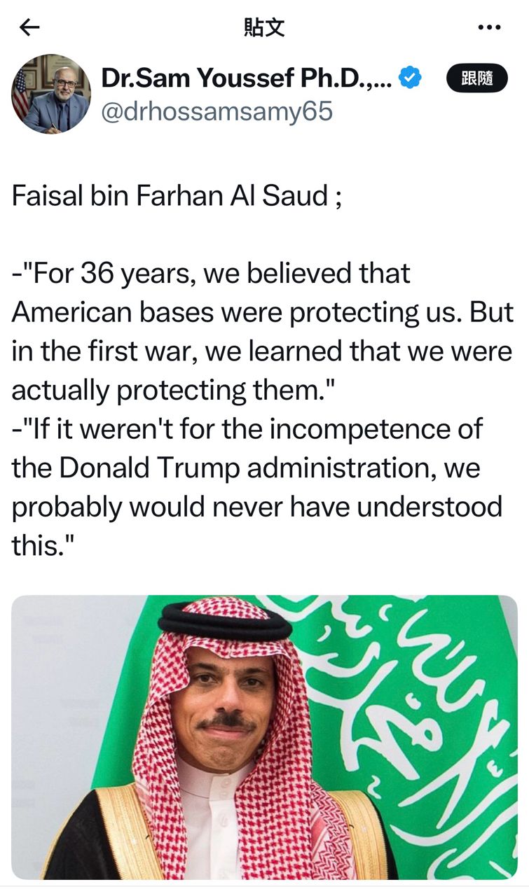 拉里賈尼在「X」帳號貼出川普在真實社群(Truth Social)的發文截圖,並以阿拉伯文