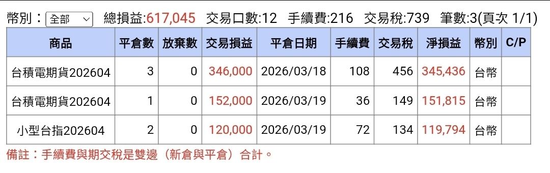 同時,台股期貨帳戶同步建倉與加碼的台積期跟小台,也在今天全部平倉。