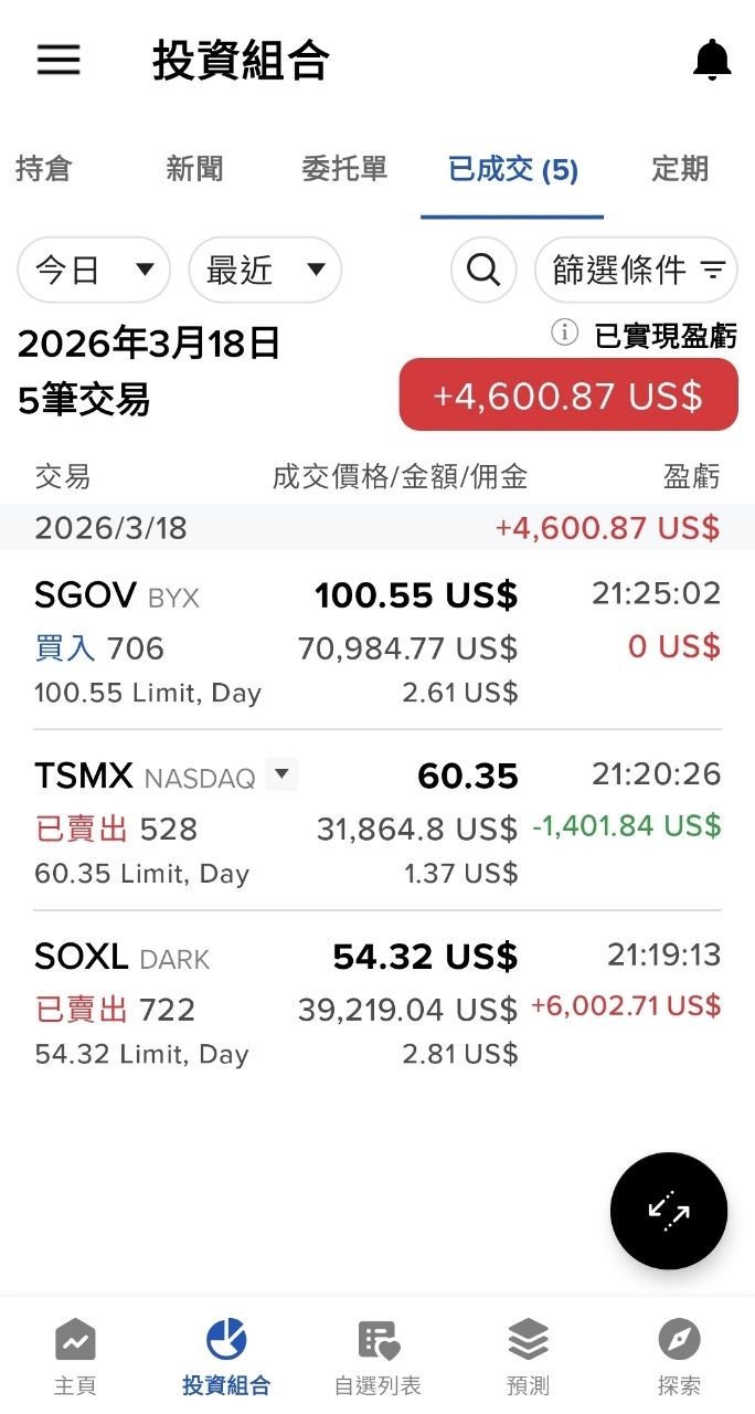 本日將這些部位全部獲利了結,資金暫時退回 SGOV 停泊,空手觀望。