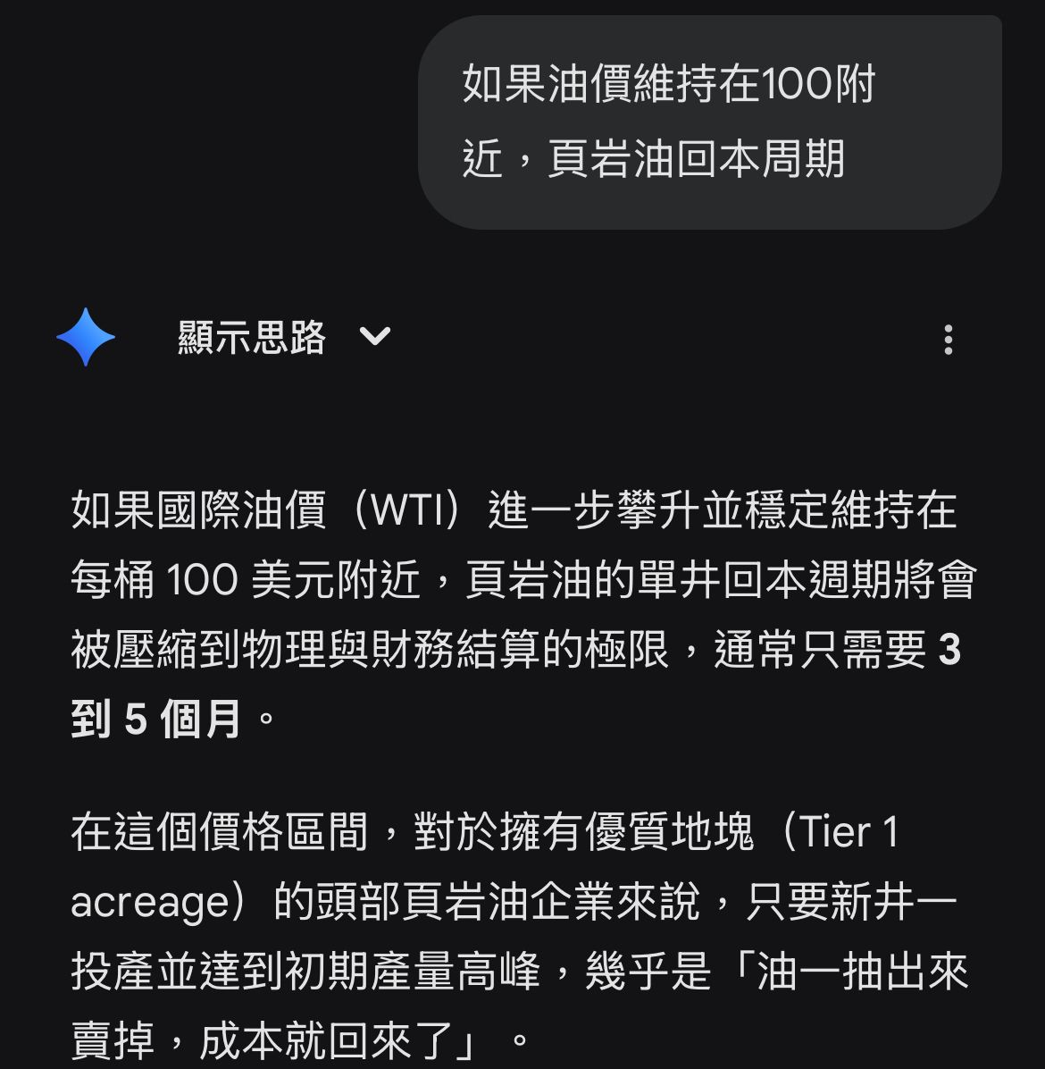 疊紀盆地(Permian Basin)等核心優質礦區的頁岩油井,回本週期通常只需 1 年到 1.5