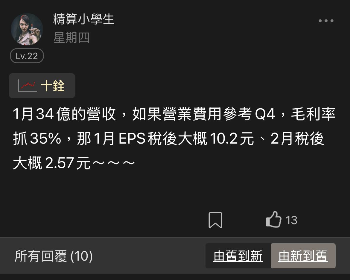 ,這些單月自結算法都一樣,稅前=營收*毛利率-營業費用跟業外,後面減項幾乎可以參