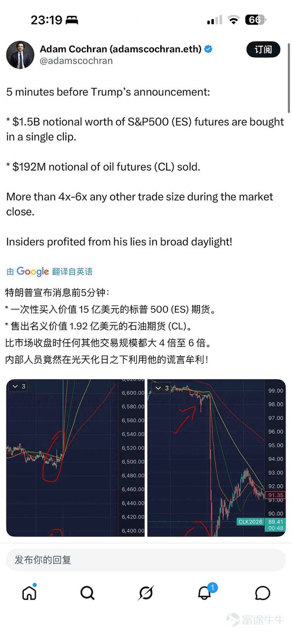 就在美國總統川普發佈「美伊談判富有成效」訊息前短短15分鐘,全球原油市場突然出現