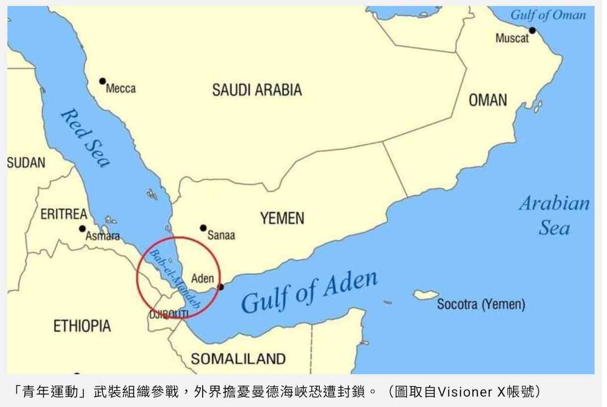 -曼德海峽(Bab el-Mandeb Strait)恐遭封鎖,危及全球約9%的海運貿易,包括約20%的