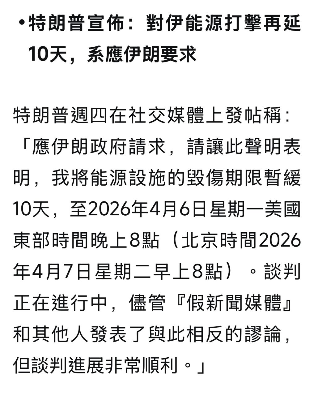 )發文指出,這項決定是回應伊朗政府的請求,暫時停止摧毀相關能源目標的計畫,期限