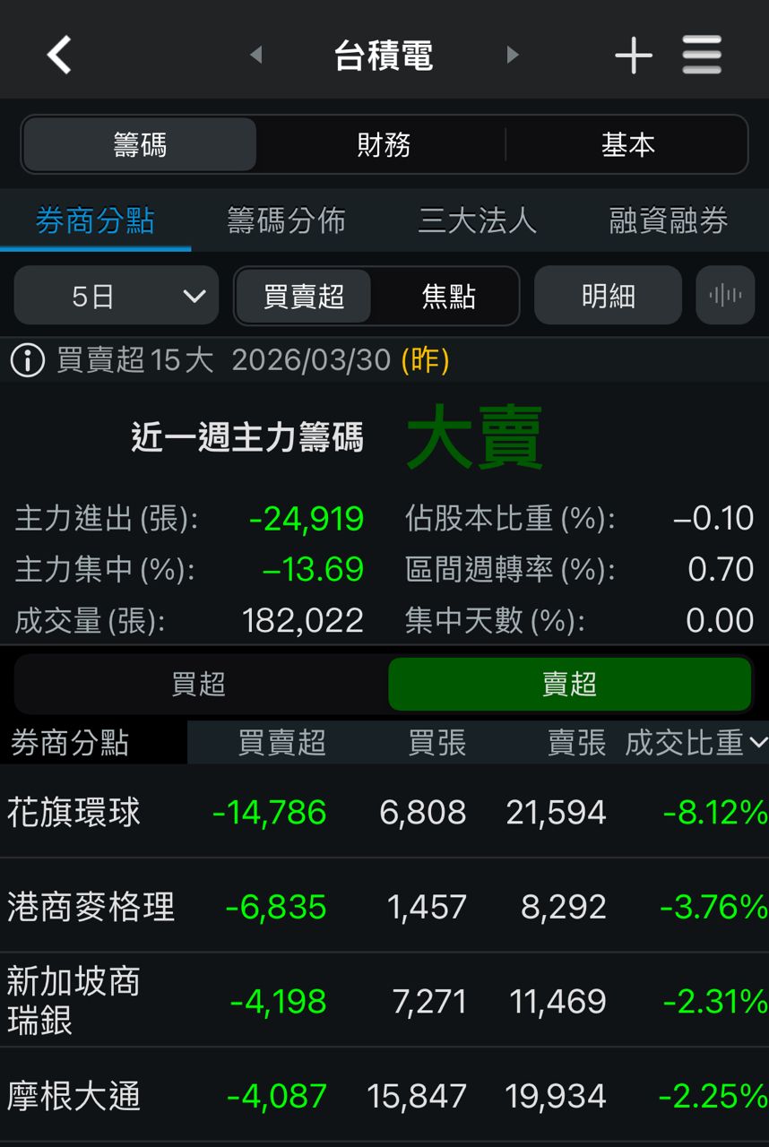 在外資持續提款下,台積電股價30日跌破季線1,781元,下跌2.2%收1,780元,領先加權