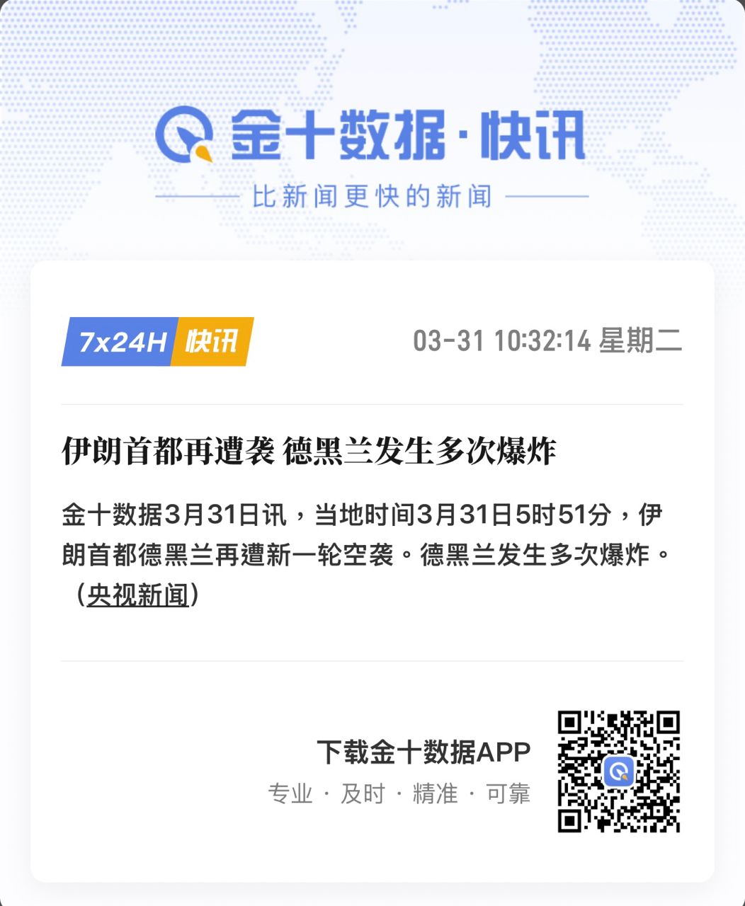 金十數據3月31日訊,當地時間3月31日5時51分,伊朗首都德黑蘭再遭新一輪空襲。德黑