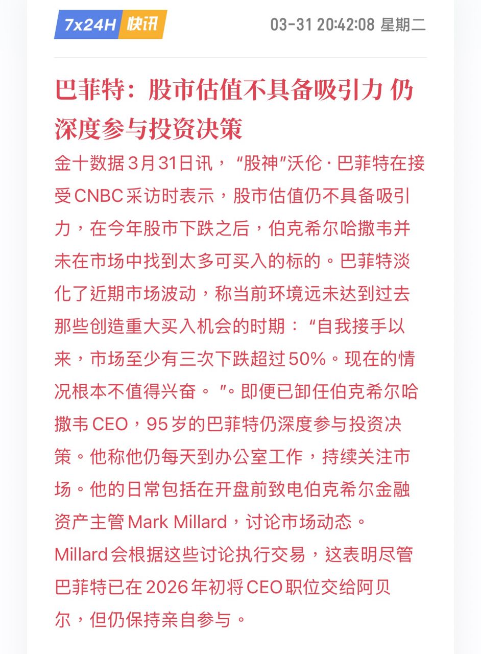 【巴菲特:股市估值不具備吸引力 仍深度參與投資決策】3月31日訊,“股神”沃倫·巴菲