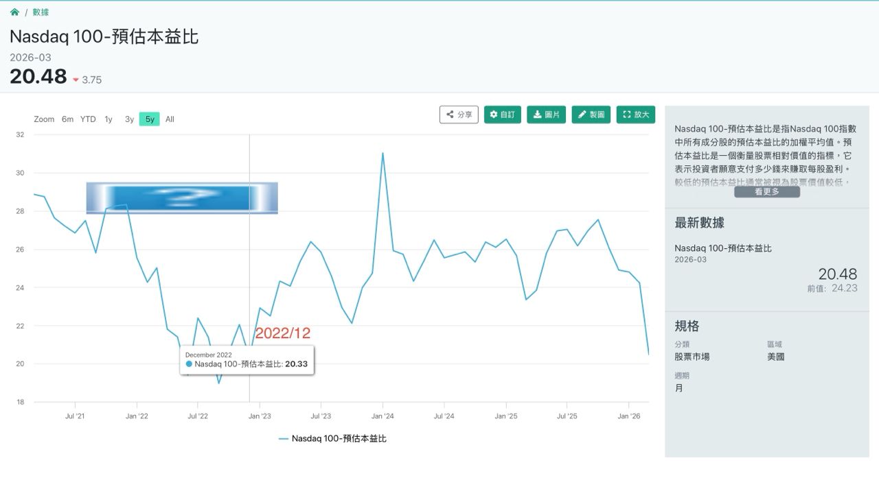 盤整一年多,加上伊朗戰爭,那斯達克指數被拋售到了2022年12月的位階。