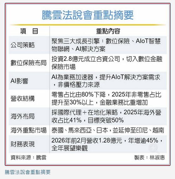 騰雲31日應台新證券之邀舉辦法說會,董事長梁基文表示,數位保險、AIoT智慧物聯網、